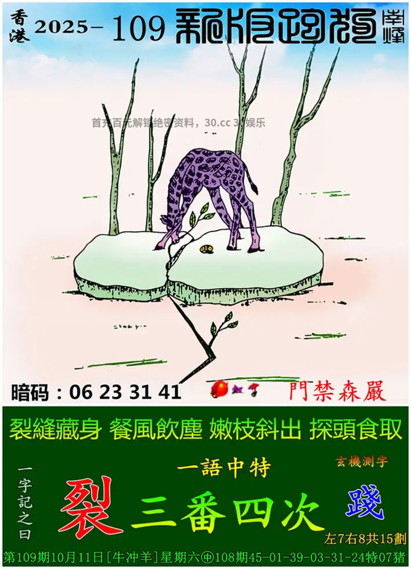109期一字記之曰:【裂】裂縫藏身,餐風飲塵,嫩枝斜出,探頭食取《踐》